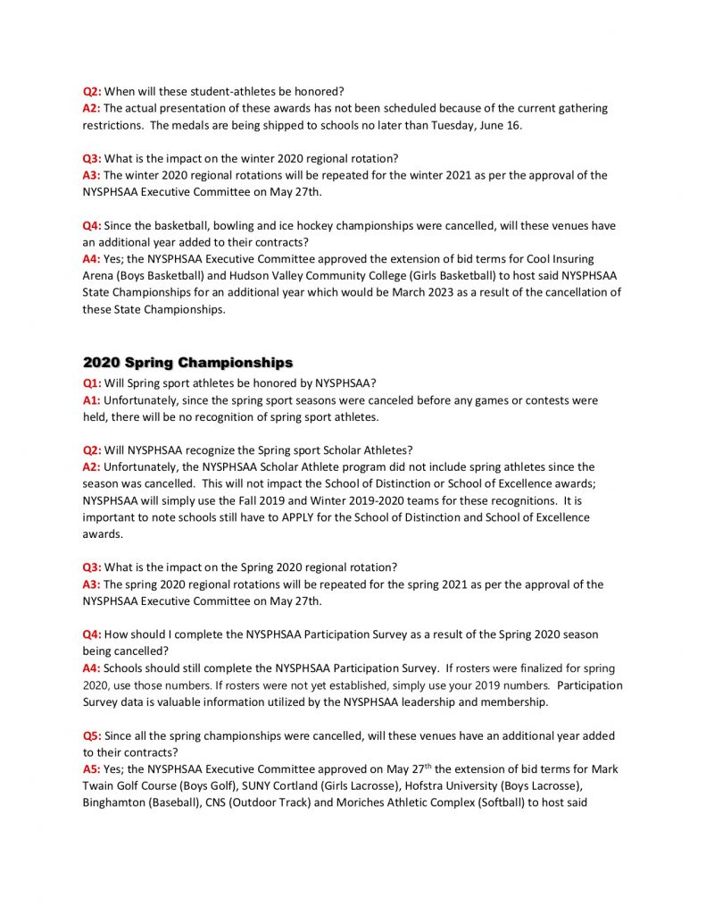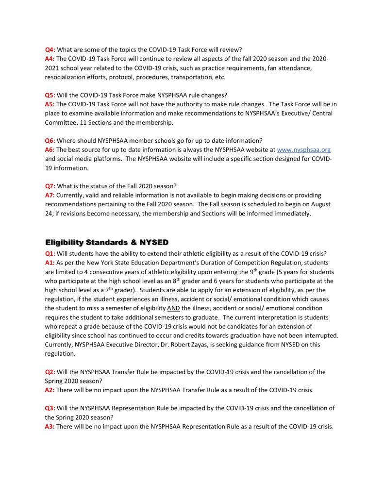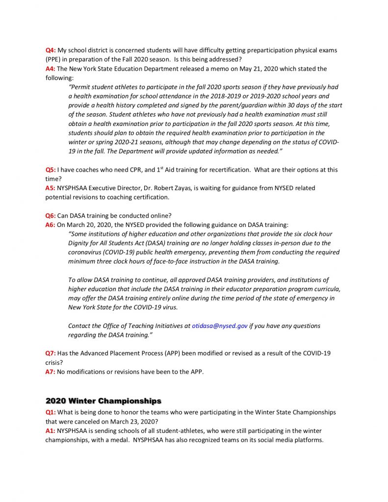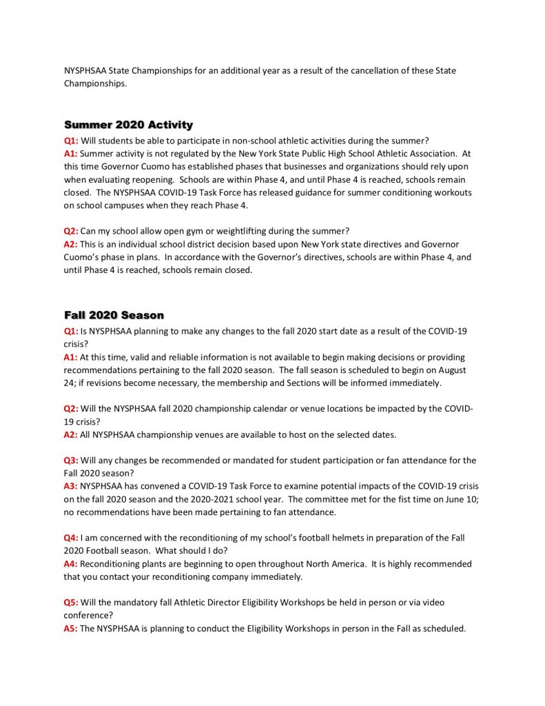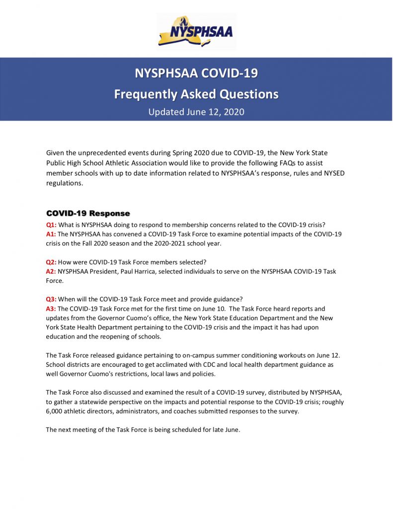 NYSPHSAA COVID-19 FAQ, Updated June 12, 2020