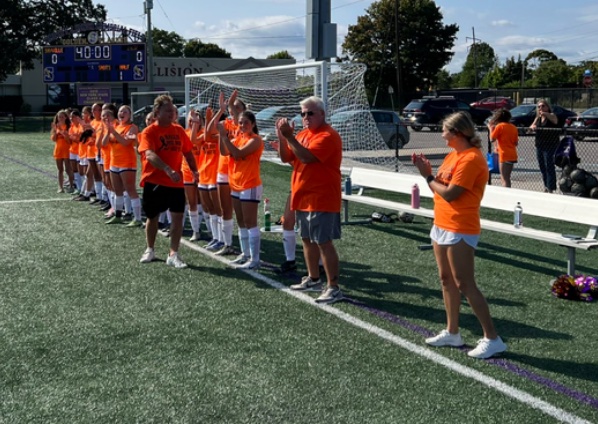 In 2019 the Sayville girls soccer team began wearing “Ballin’ for Bob” shirts in the fall to recognize assistant coach Bob Holmes and his fight against multiple sclerosis. The Golden Flashes wore orange last week against Islip.