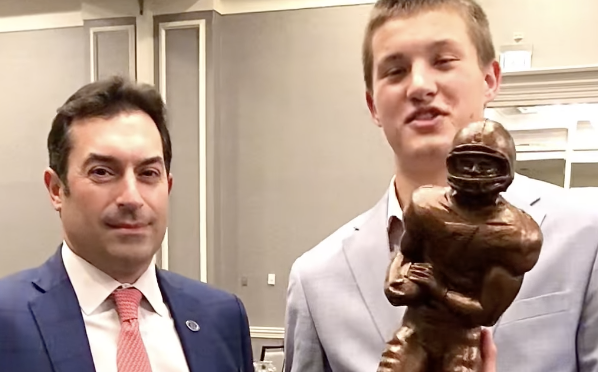Dr. Paci from Orlin & Cohen Sports Medicine congratulates Brady Clark from Bayport-Blue Point on winning the Hansen Award, presented to the top football player in Suffolk County!